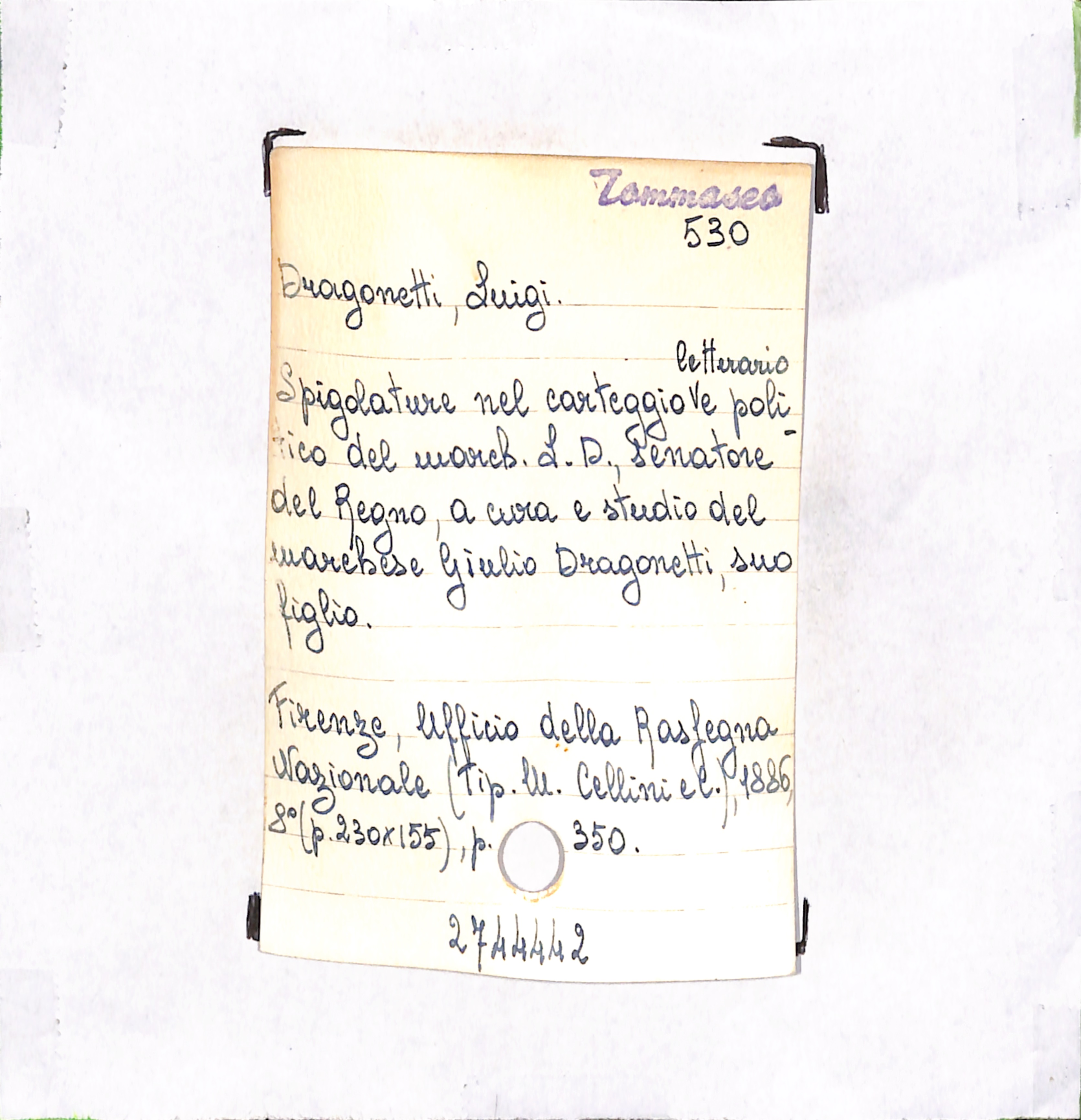 U.D. monografia Spigolature nel carteggio letterario e politico del mach. L. D., senatore del Regno, a cura e studio del marchese Giulio Dragonetti, suo figlio