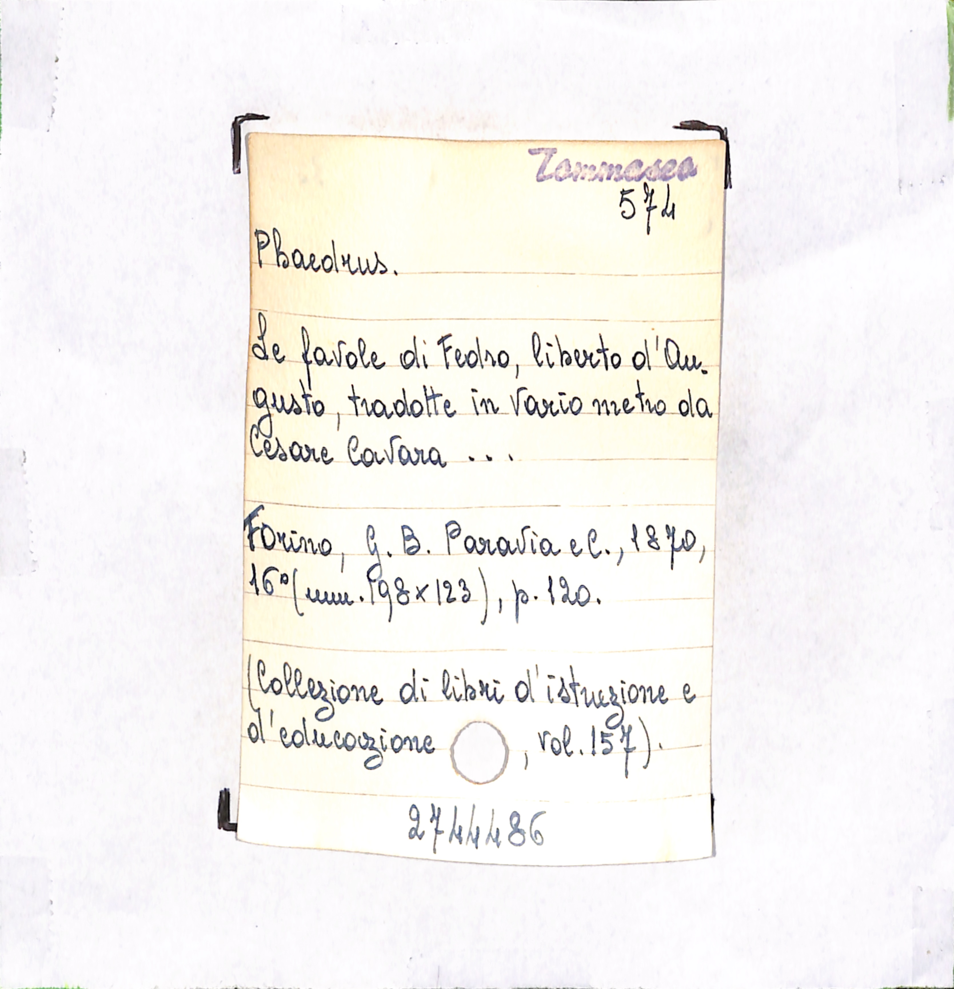 U.D. monografia Le favole di Fedro, liberto d'Augusto, tradotte in vario metro da Cesare Cavara…