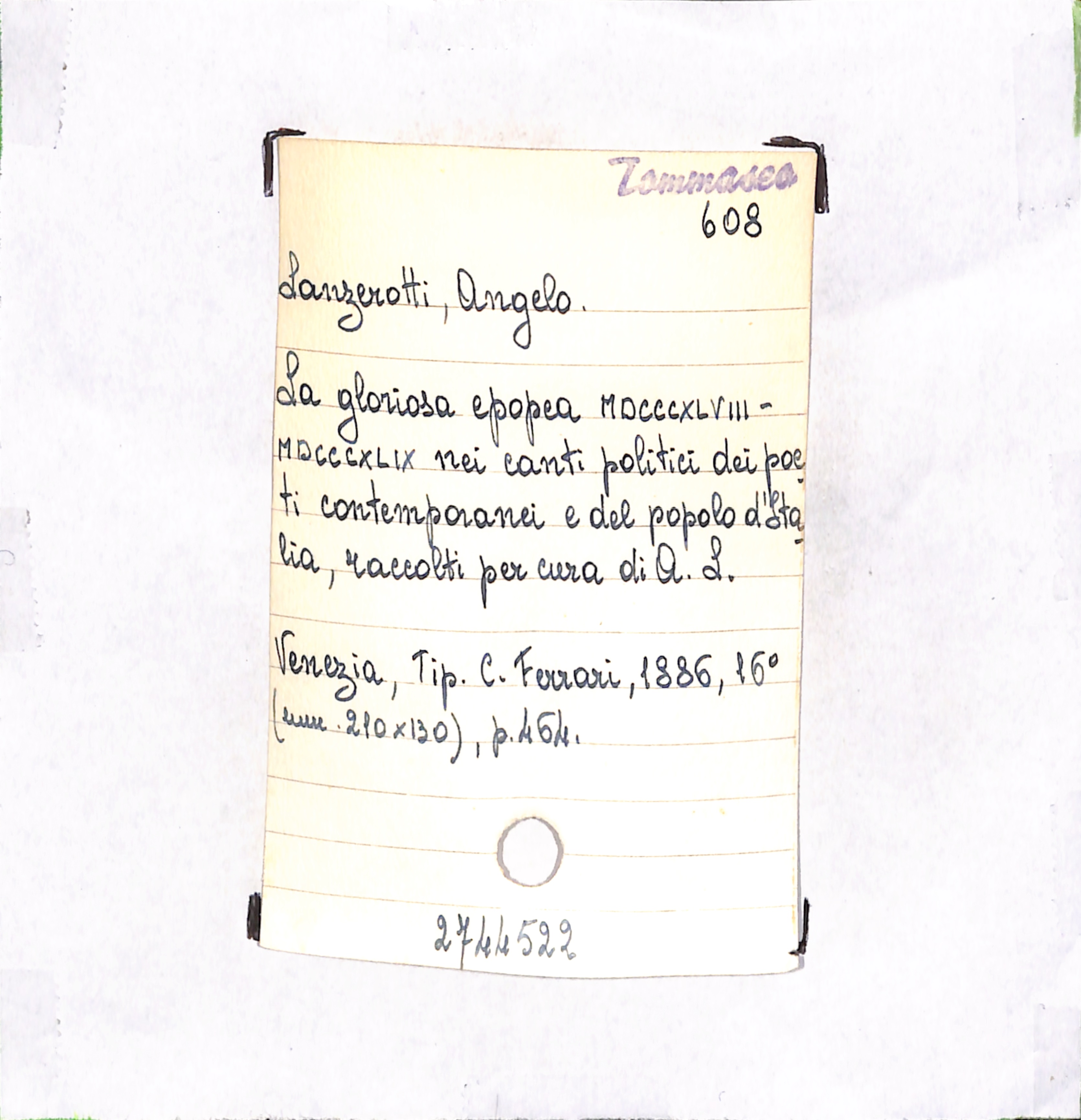 • La gloriosa epopea MDCCCXLVIII - MDCCCXLIX nei canti politici dei poeti contemporanei e del popolo d'Italia, raccolti per cura di A. L.