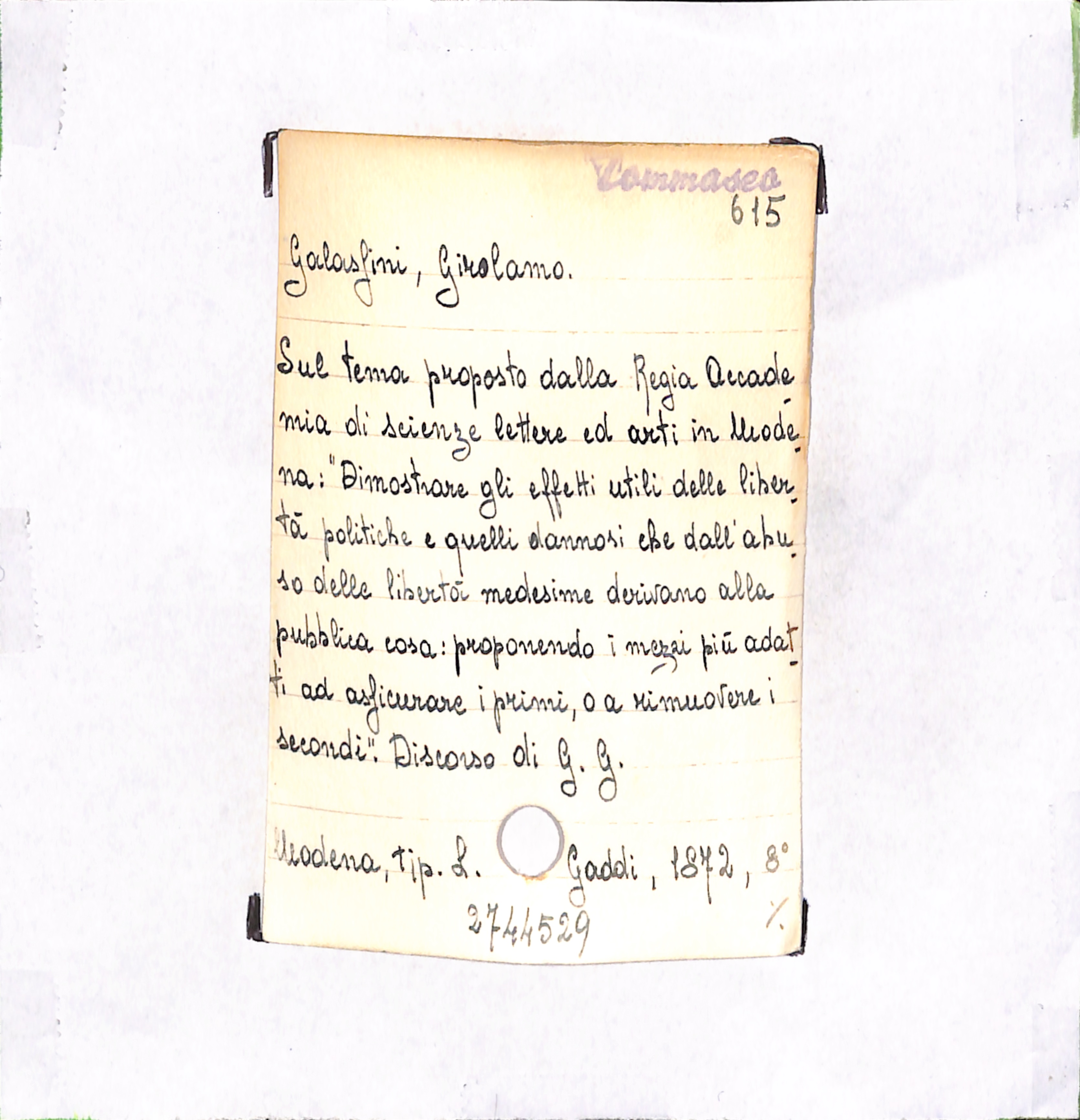 U.D. monografia Sul tema proposto dalla Regia Accademia di scienze lettere ed arti in Modena: "Dimostrare gli effetti utili delle libertà politiche e quelli dannosi che dall'abuso delle libertà medesime derivano alla pubblica cosa: proponendo i mezzi più adatti ad assicu