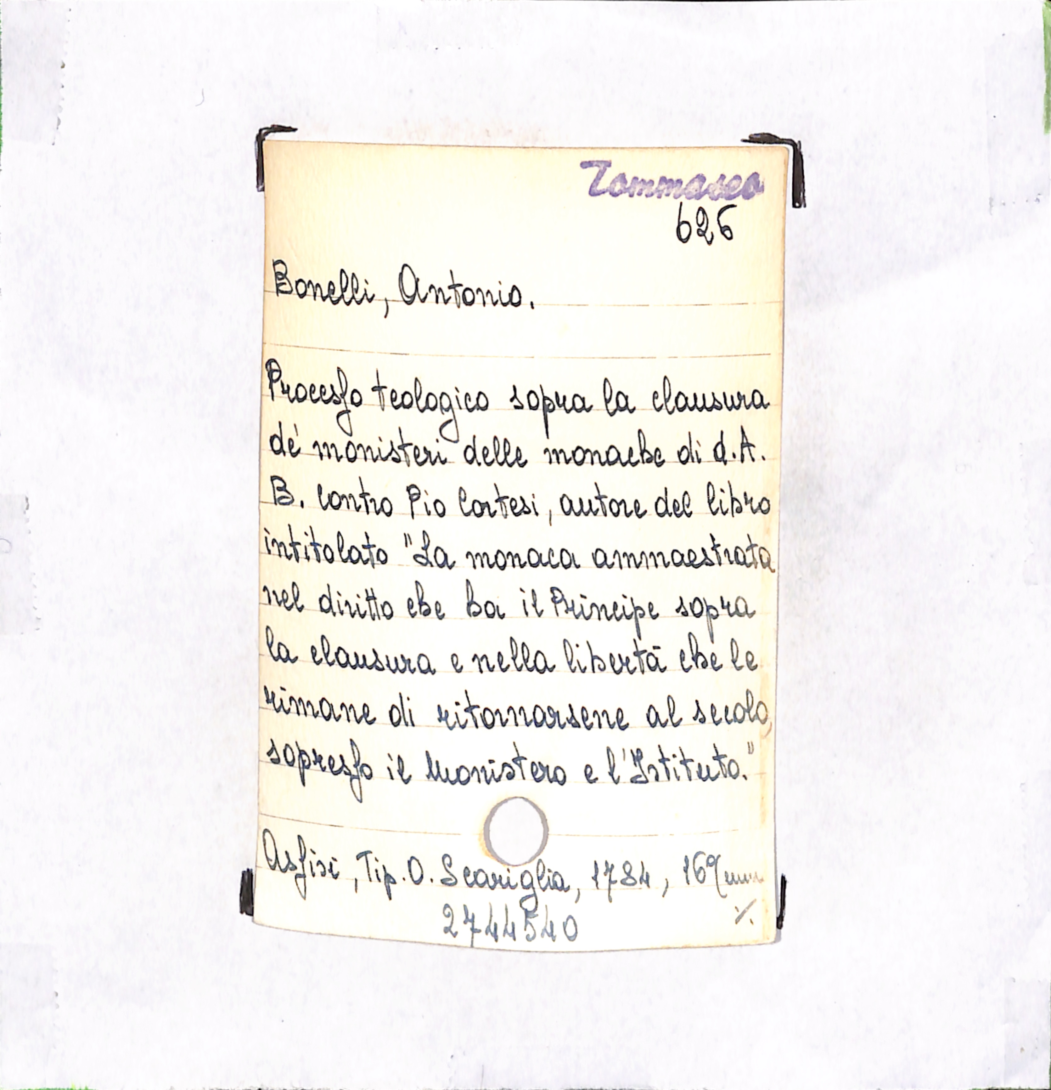 U.D. monografia Processo teologico sopra la clausura de' monasteri delle monache di d. A. B. contro Pio Cortesi, autore del libro intitolato "La monaca ammaestrata nel diritto che ha il Principe sopra la clausura e nella libertà che le rimane di ritornarsene al secolo, s