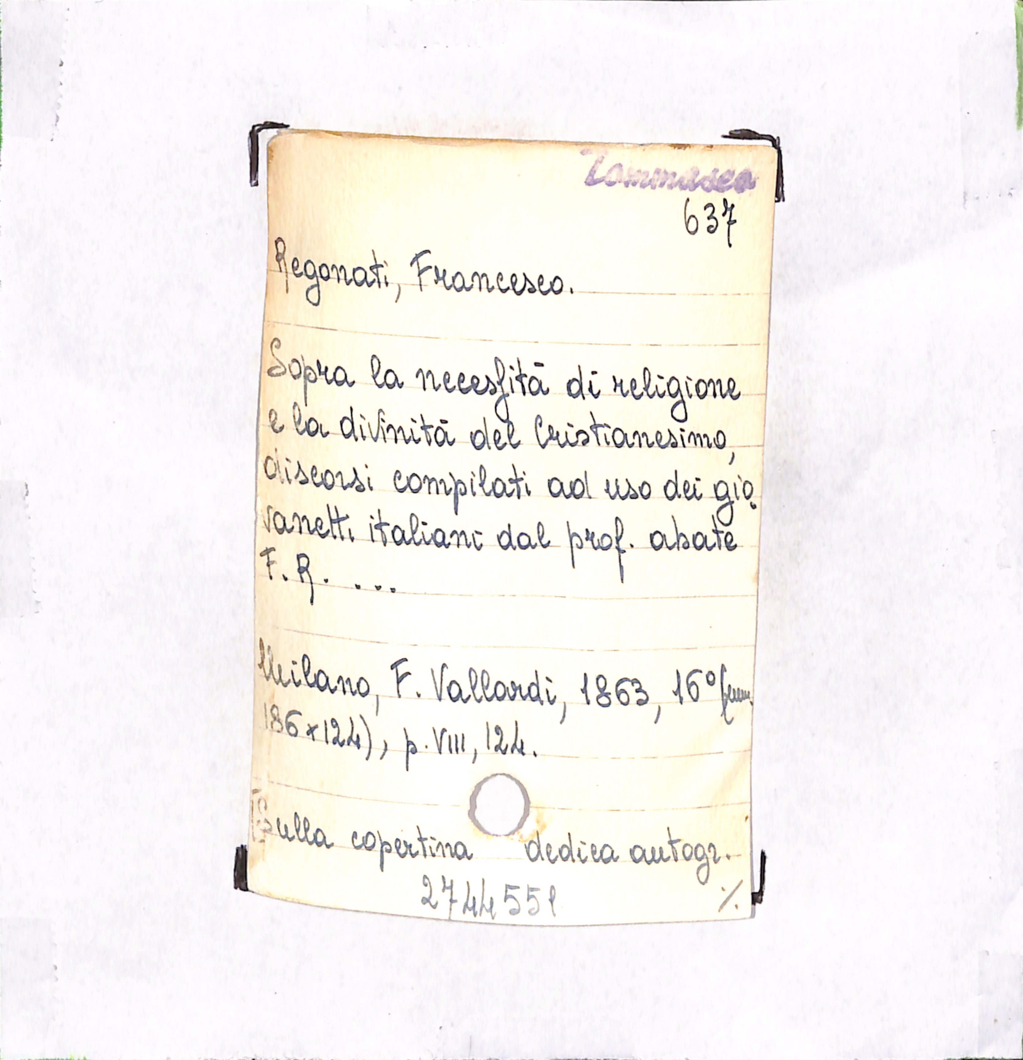U.D. monografia Sopra la necessità di religione e la divinità del Cristianesimo, discorsi compilati ad uso dei giovanetti italiani dal prof. abate F. R. …
