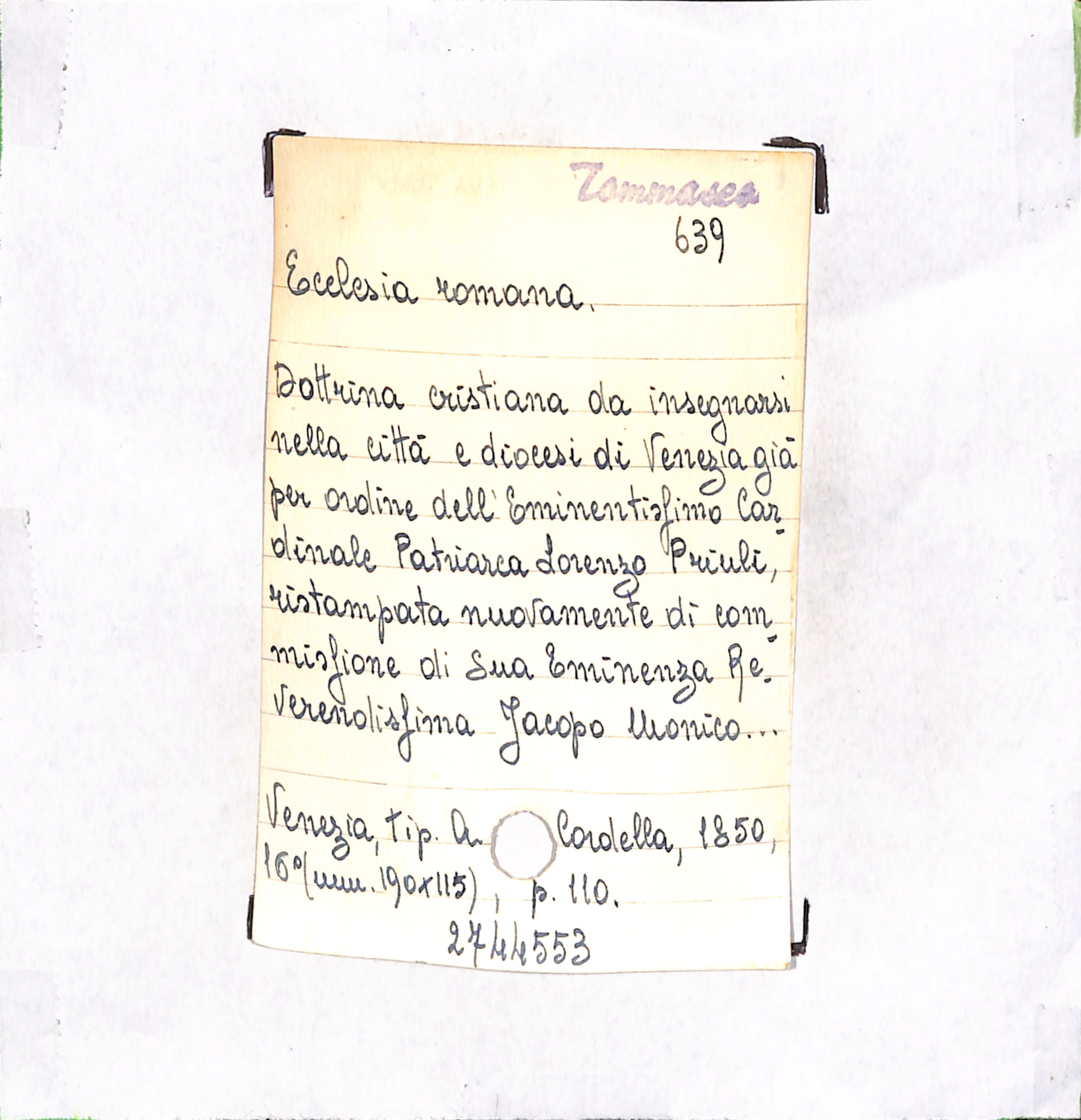 U.D. monografia Dottrina cristiana da insegnarsi nella città e diocesi di Venezia già per ordine dell'Eminentissimo Cardinale Patriarca Lorenzo Priuli, ristampata nuovamente di commissione di Sua Eminenza Reverendissima Jacopo Monico…