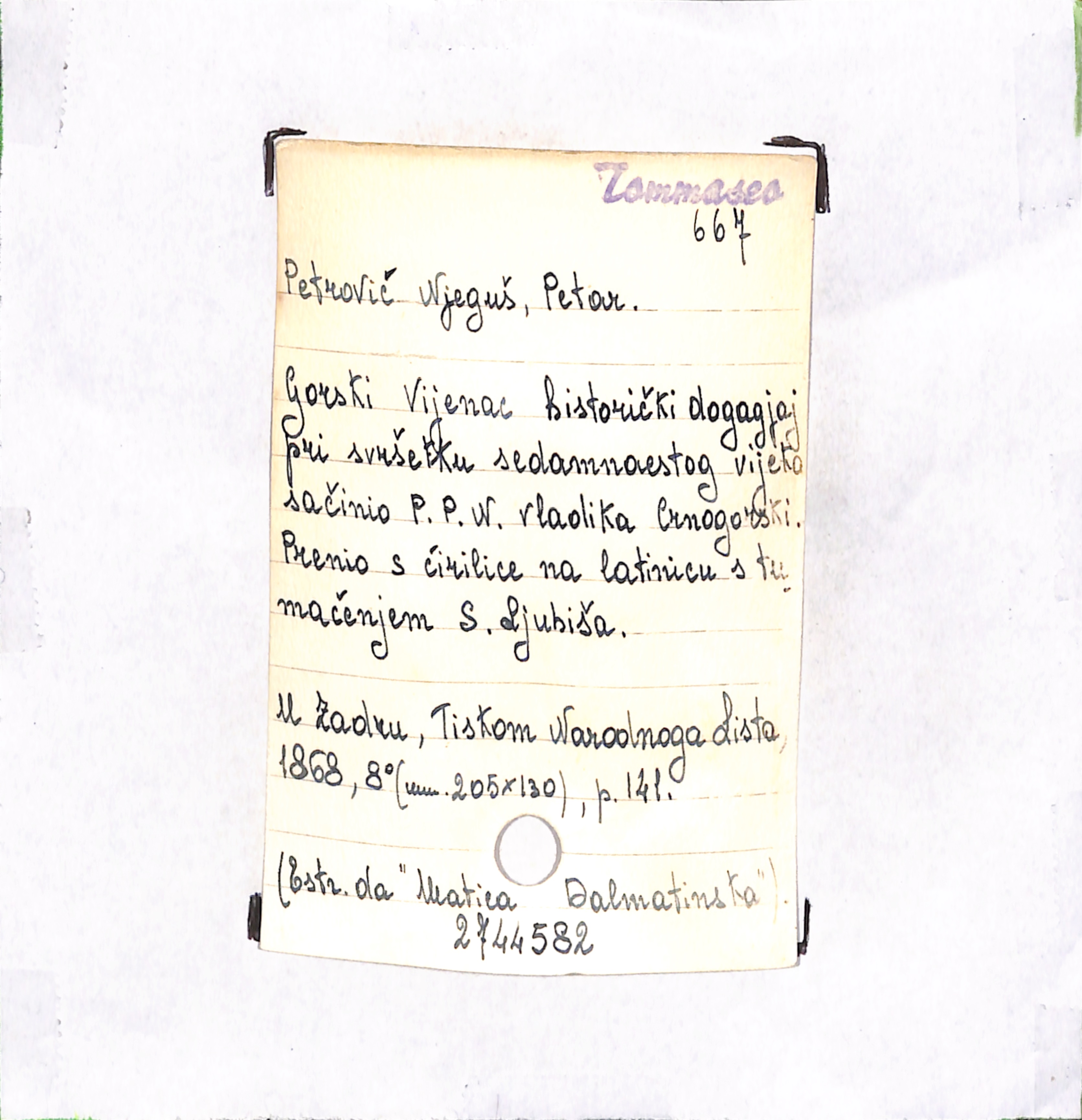 U.D. monografia Gorski Vijenac historički dogagjaj pri svršetku sedamnaestog vijeko sačinio P. P. N. vladika Crnogorski. Premio s ćirilice na latinicu s tumačenjem S. Ljubiša