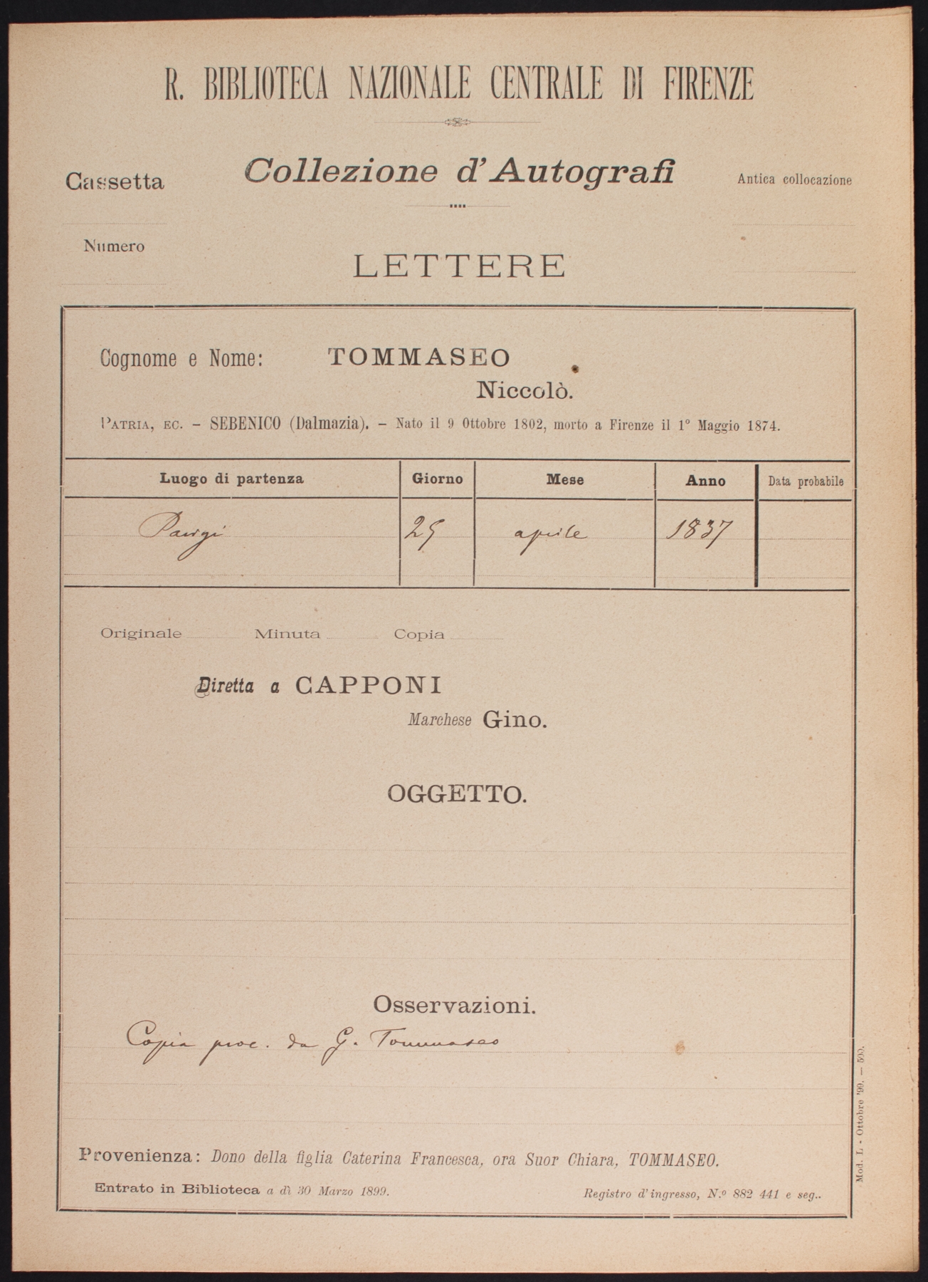 Sottofascicolo N. Tommaseo a G. Capponi - 25 aprile 1837