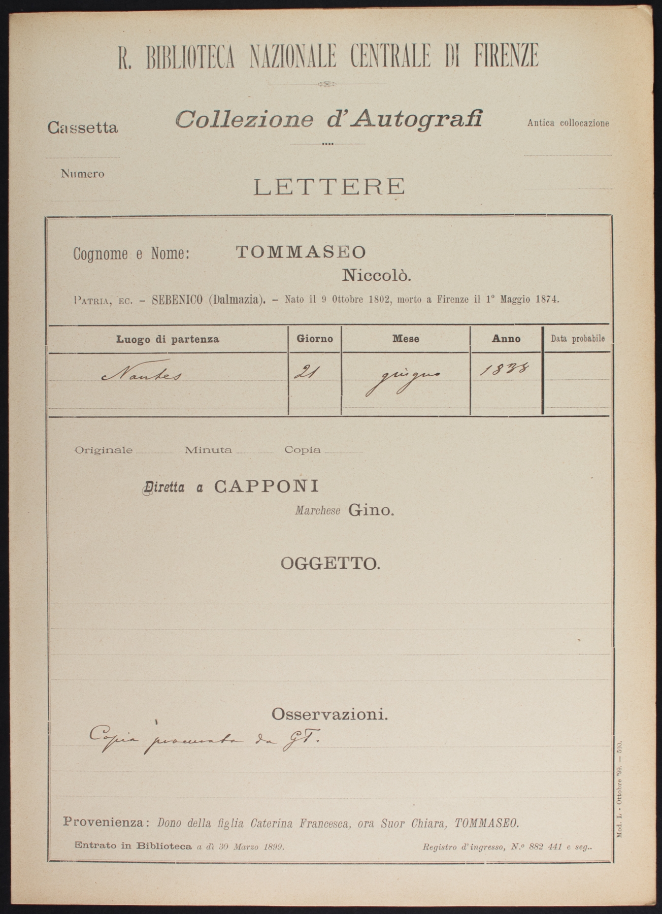 Sottofascicolo N. Tommaseo a G. Capponi - 21 giugno 1838