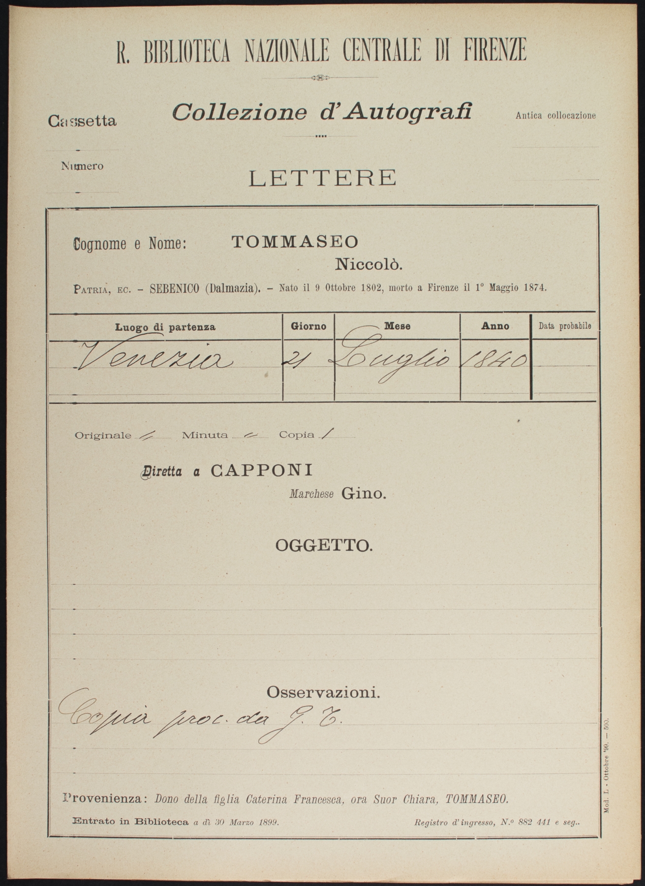 Sottofascicolo N. Tommaseo a G. Capponi - 21 luglio 1840