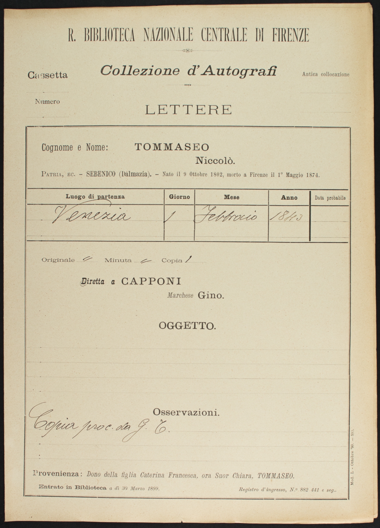 Sottofascicolo N. Tommaseo a G. Capponi - 1 febbraio 1843