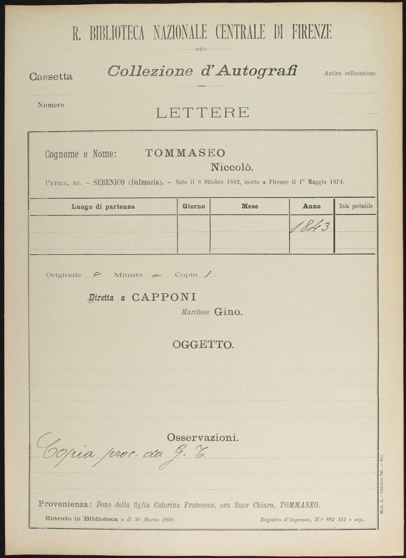 • N. Tommaseo a G. Capponi - (…) 1843