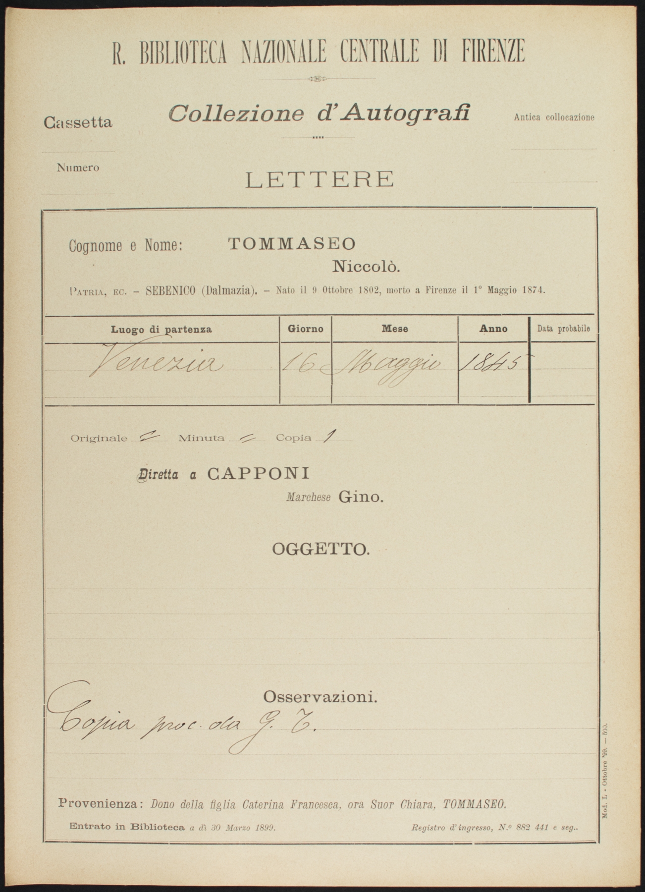 Sottofascicolo N. Tommaseo a G. Capponi - 16 maggio 1845