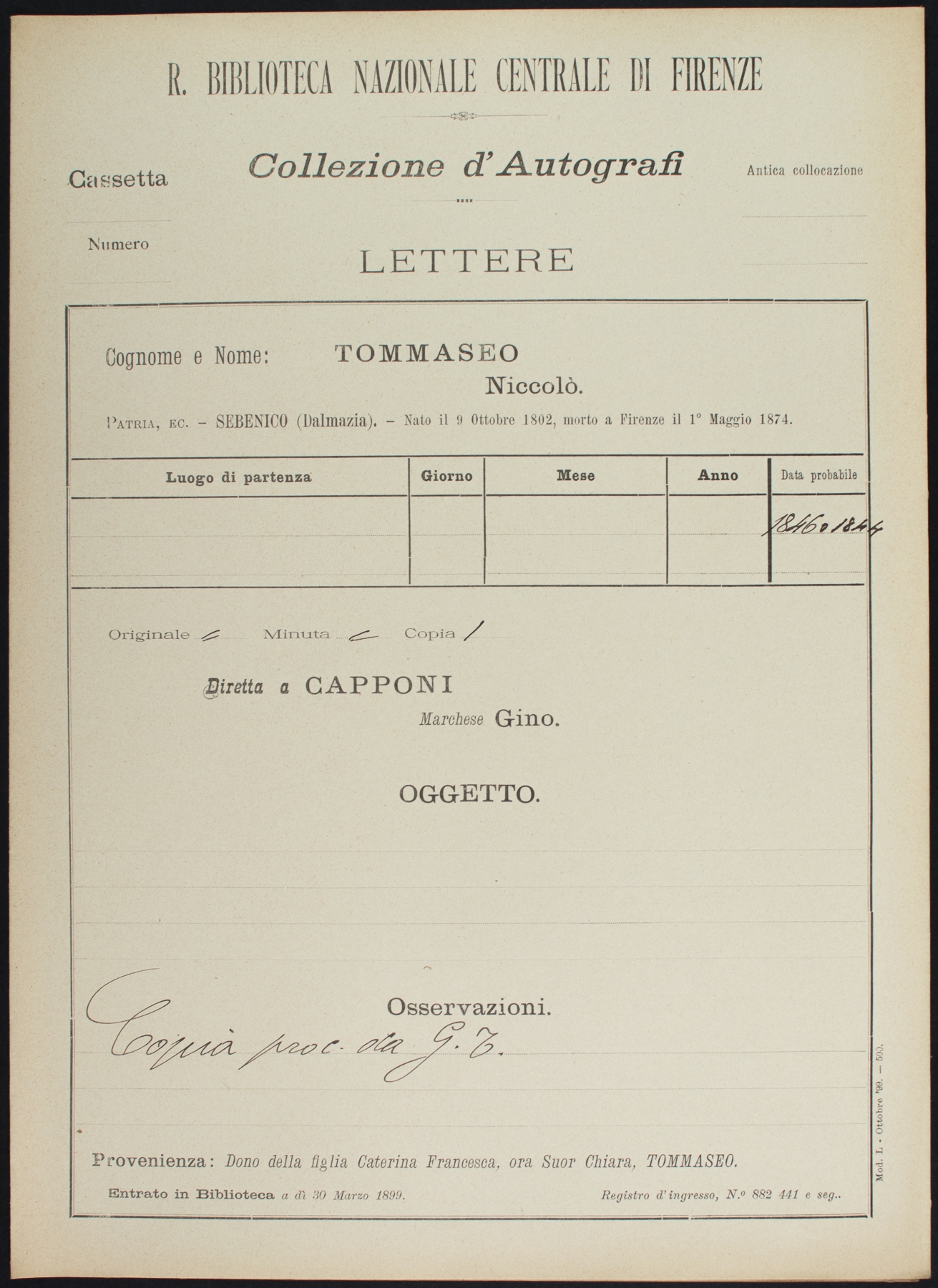 • N. Tommaseo a G. Capponi - [1846 o 1844]
