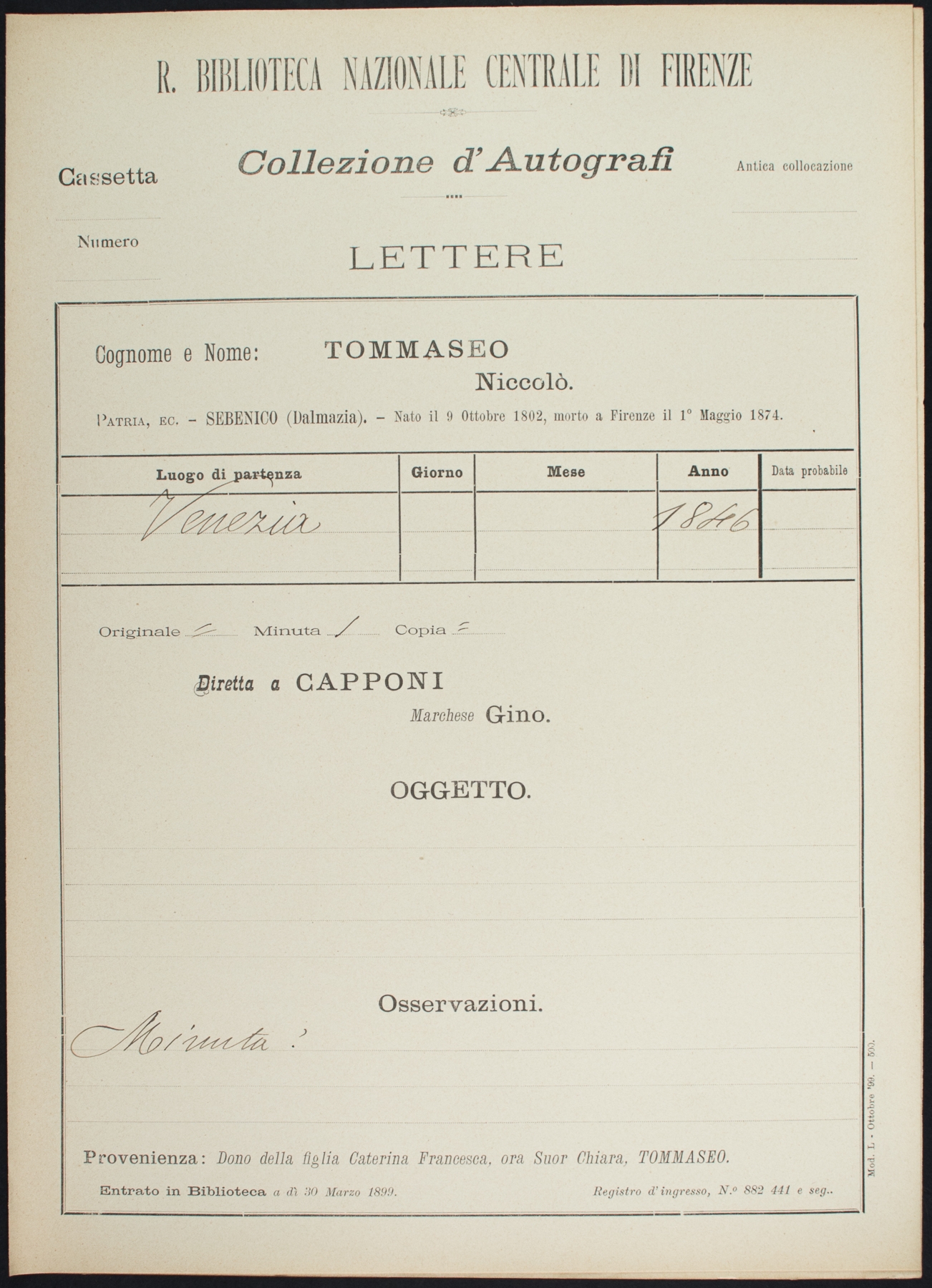 Sottofascicolo N. Tommaseo a G. Capponi - (…) 1846