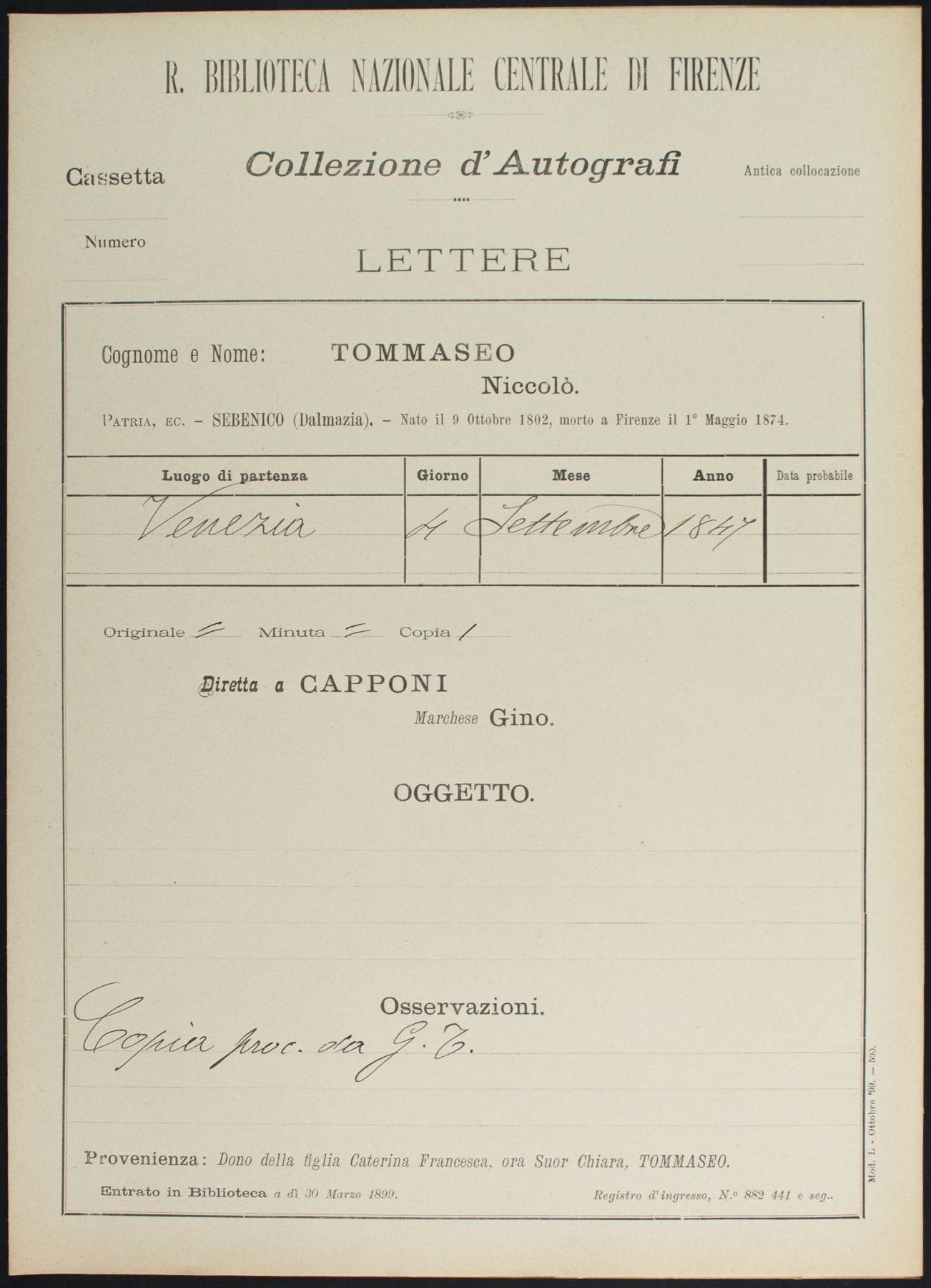 Sottofascicolo N. Tommaseo a G. Capponi - 4 settembre 1847