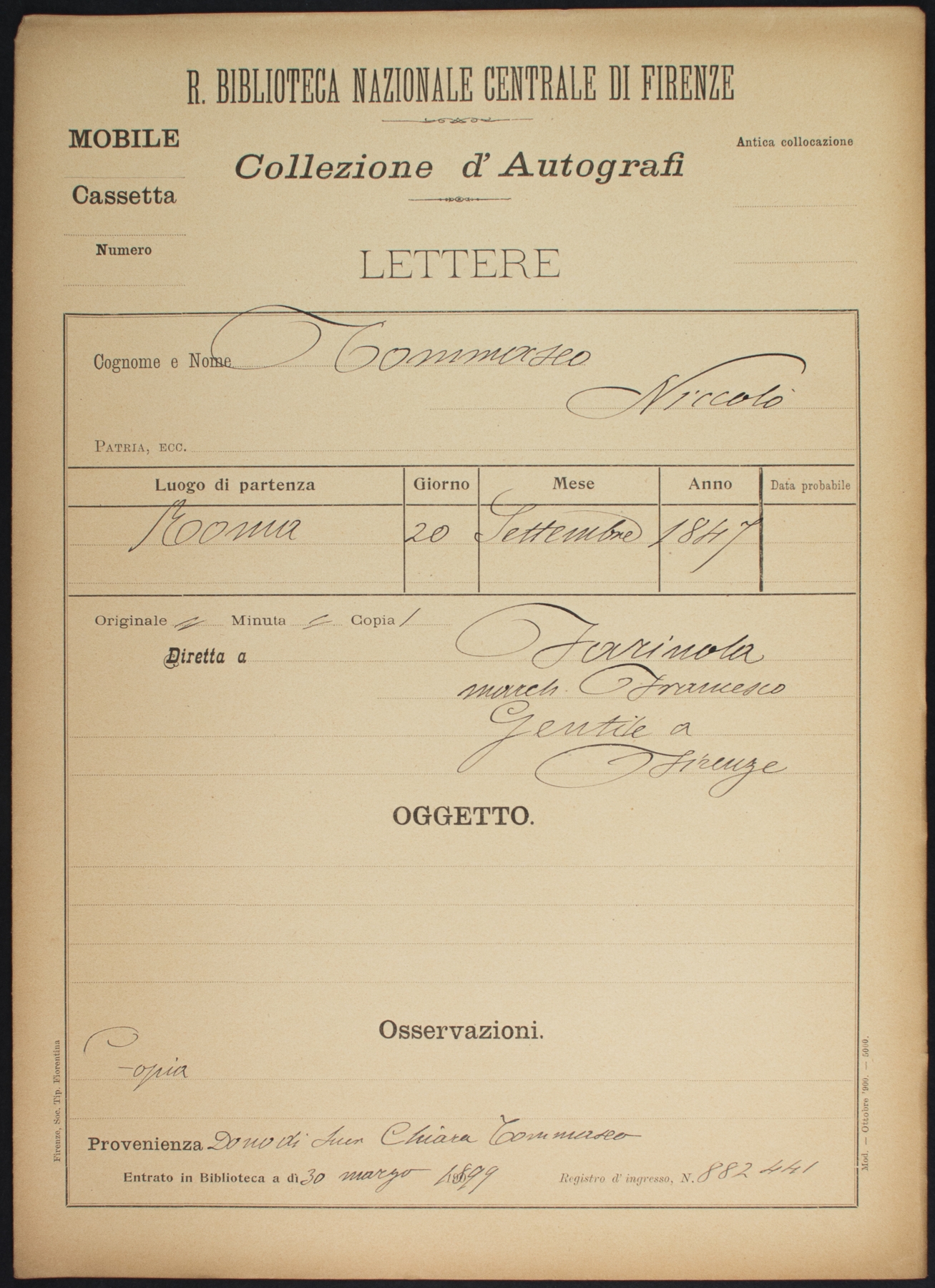 Sottofascicolo N. Tommaseo a M. Farinola - 20 settembre 1847