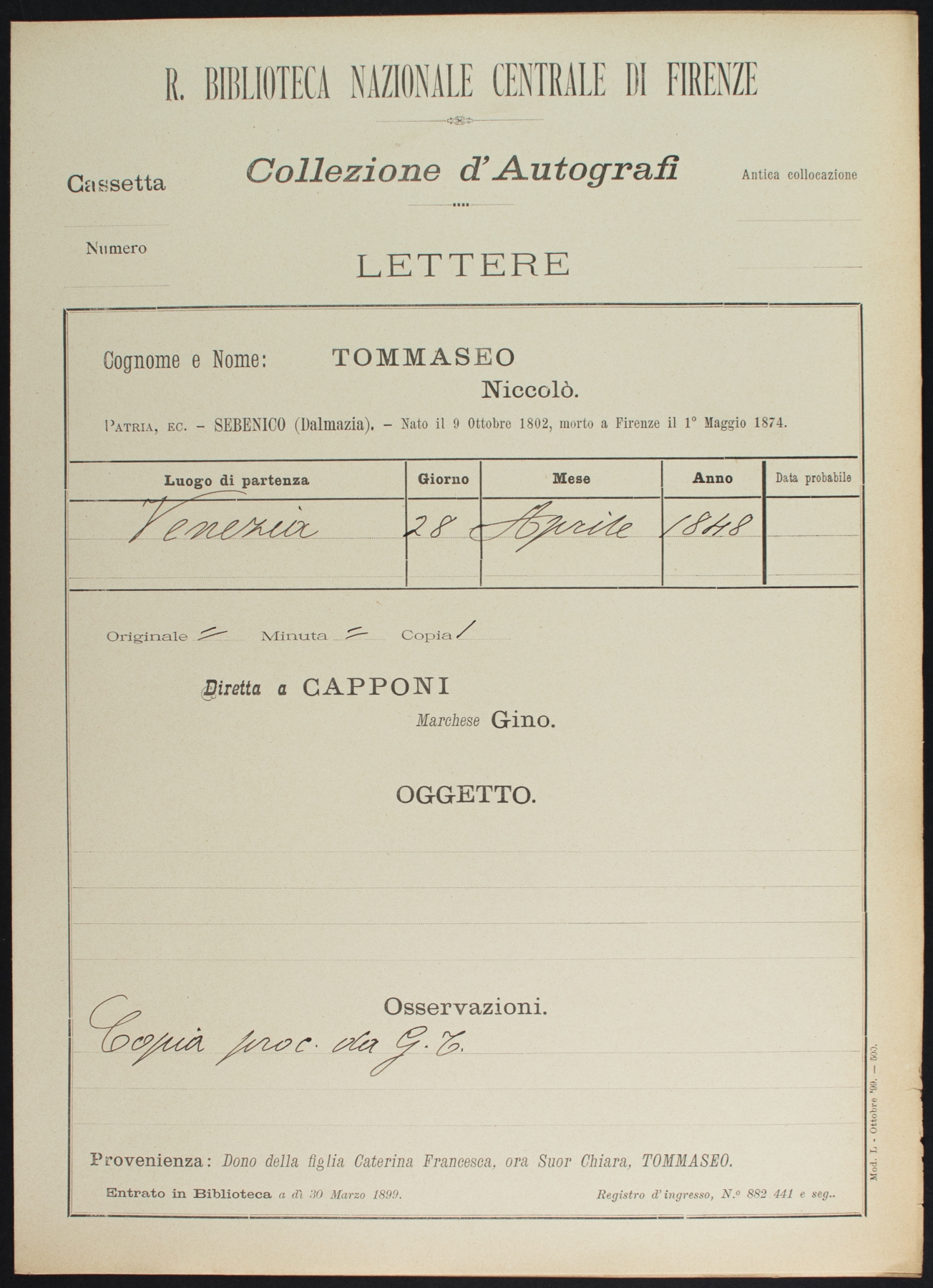 • N. Tommaseo a G. Capponi - 28 aprile 1848