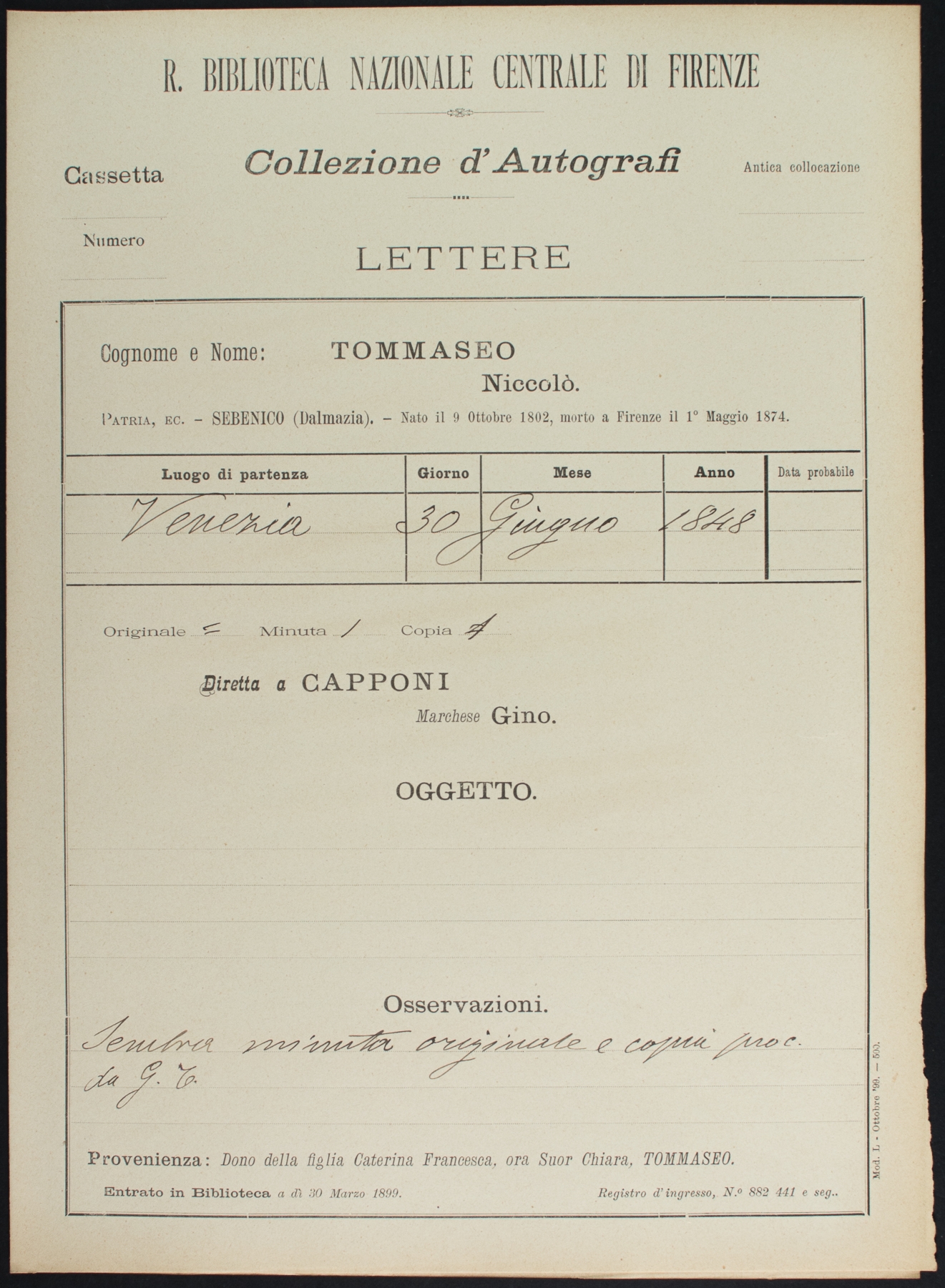 Sottofascicolo N. Tommaseo a G. Capponi - 30 giugno 1848