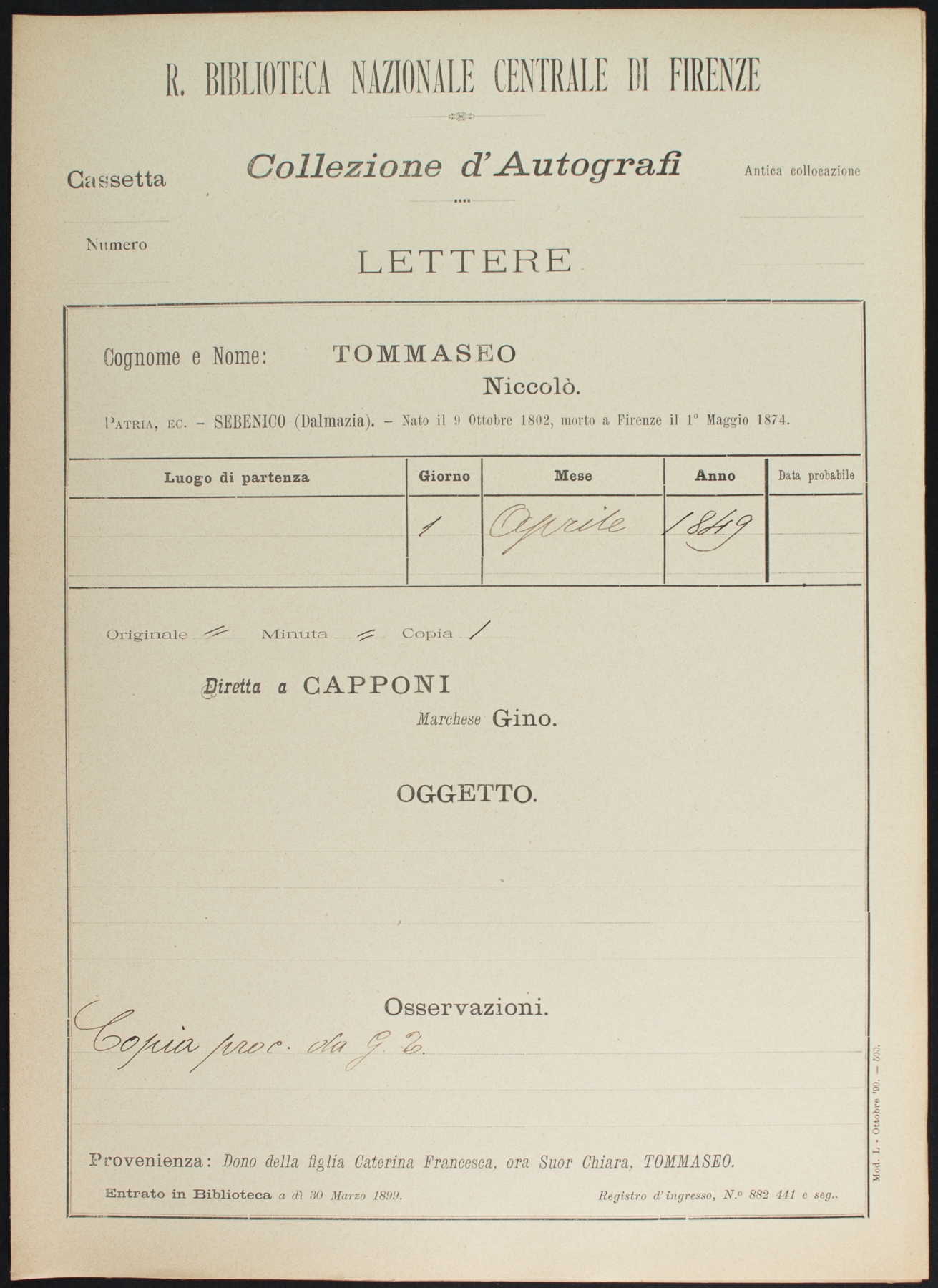 • N. Tommaseo a G. Capponi - 1 aprile 1849