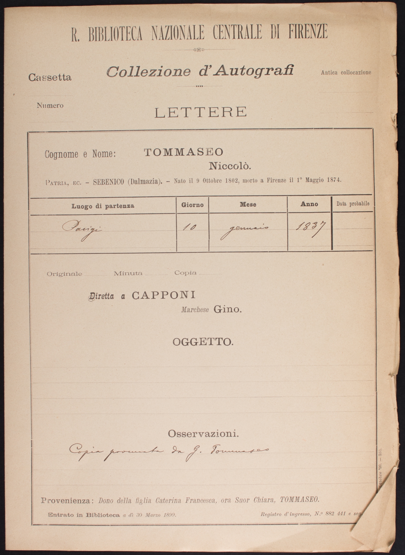 • Fondo Tommaseo presso Biblioteca Nazionale Centrale di Firenze (BNCF)