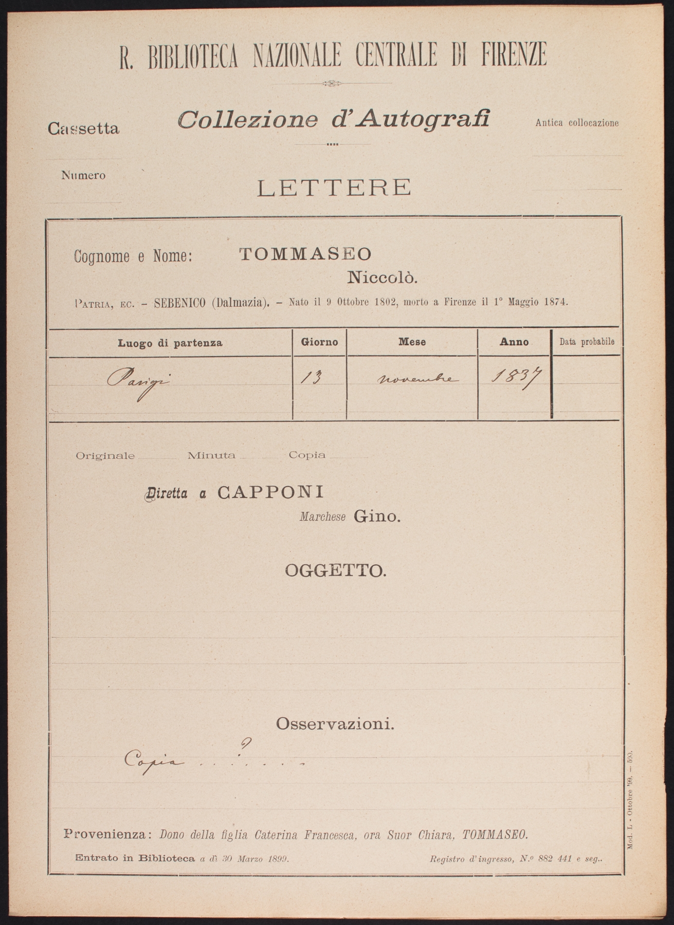 • Fondo Tommaseo presso Biblioteca Nazionale Centrale di Firenze (BNCF)