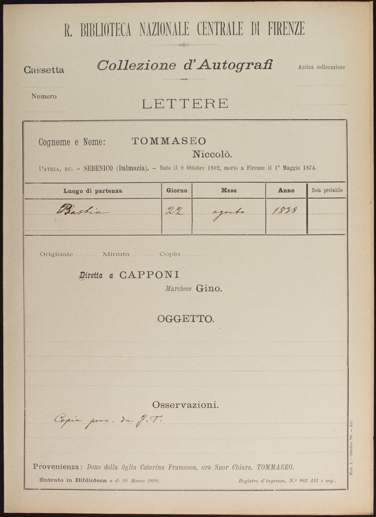 • Fondo Tommaseo presso Biblioteca Nazionale Centrale di Firenze (BNCF)