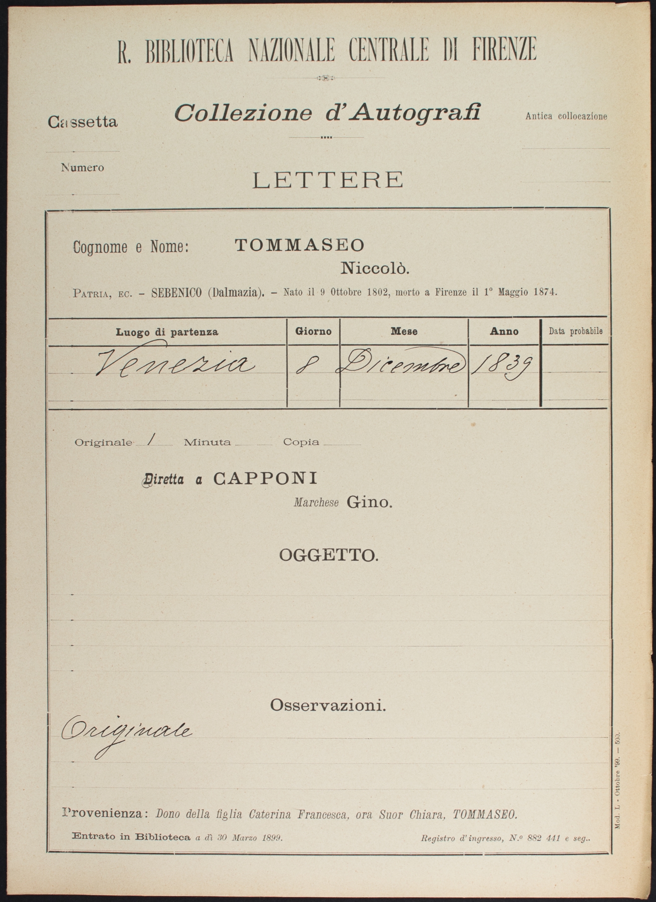 • Fondo Tommaseo presso Biblioteca Nazionale Centrale di Firenze (BNCF)