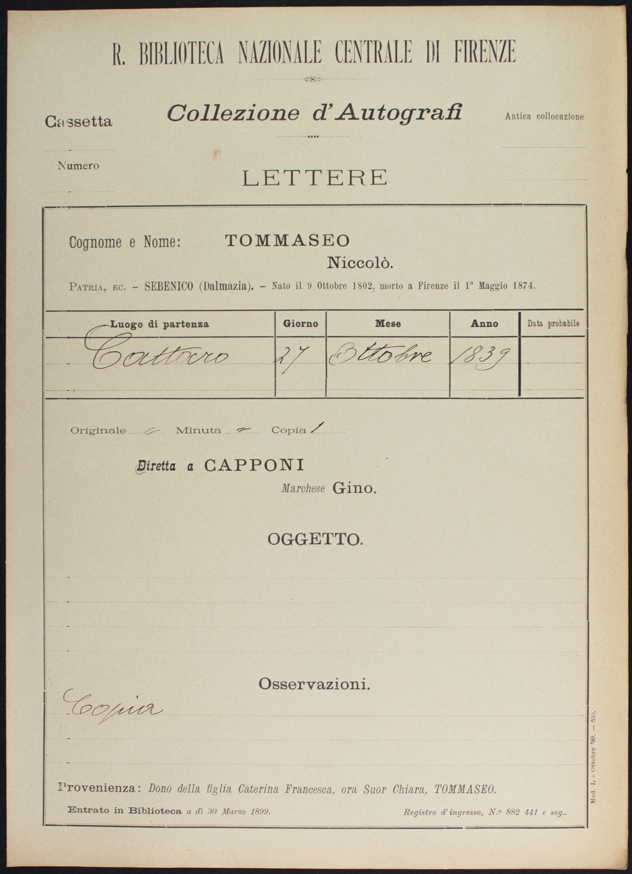 • Fondo Tommaseo presso Biblioteca Nazionale Centrale di Firenze (BNCF)