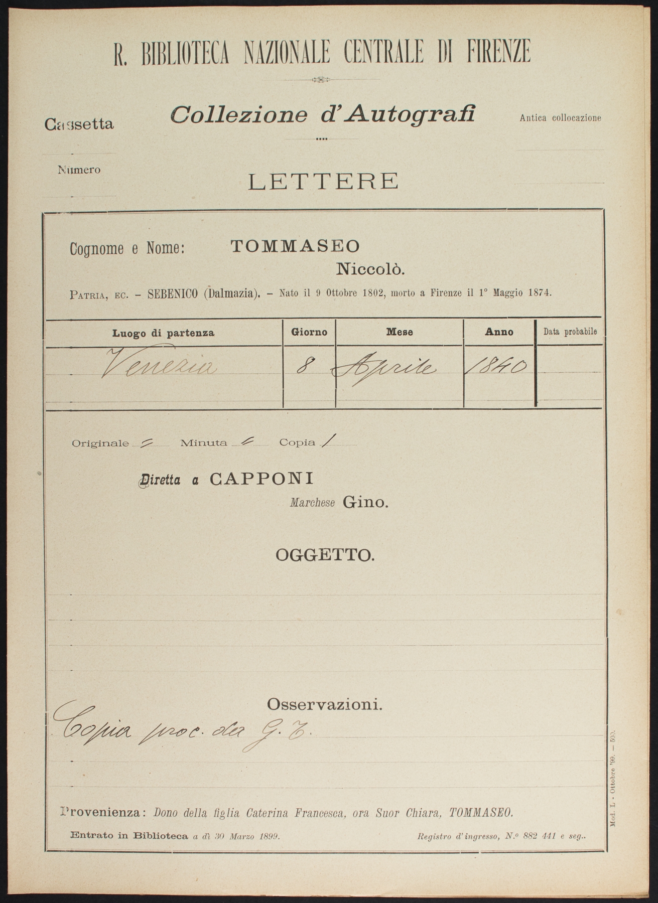 • Fondo Tommaseo presso Biblioteca Nazionale Centrale di Firenze (BNCF)