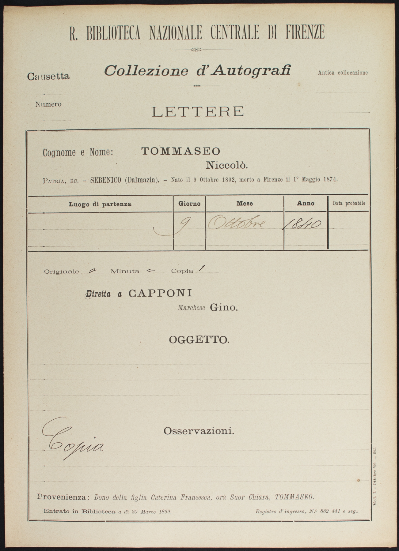 Sottofascicolo N. Tommaseo a G. Capponi - 9 ottobre 1840