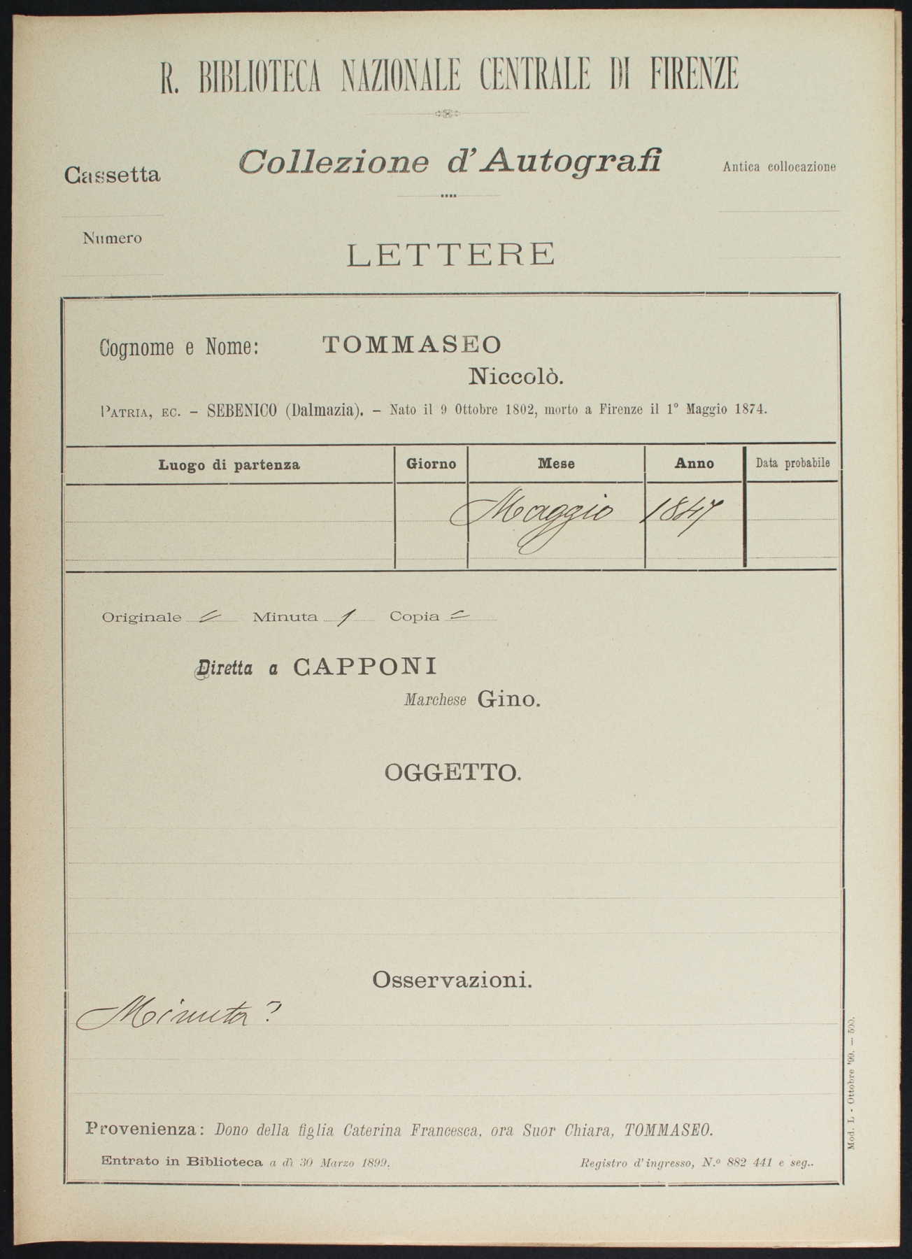 • Fondo Tommaseo presso Biblioteca Nazionale Centrale di Firenze (BNCF)