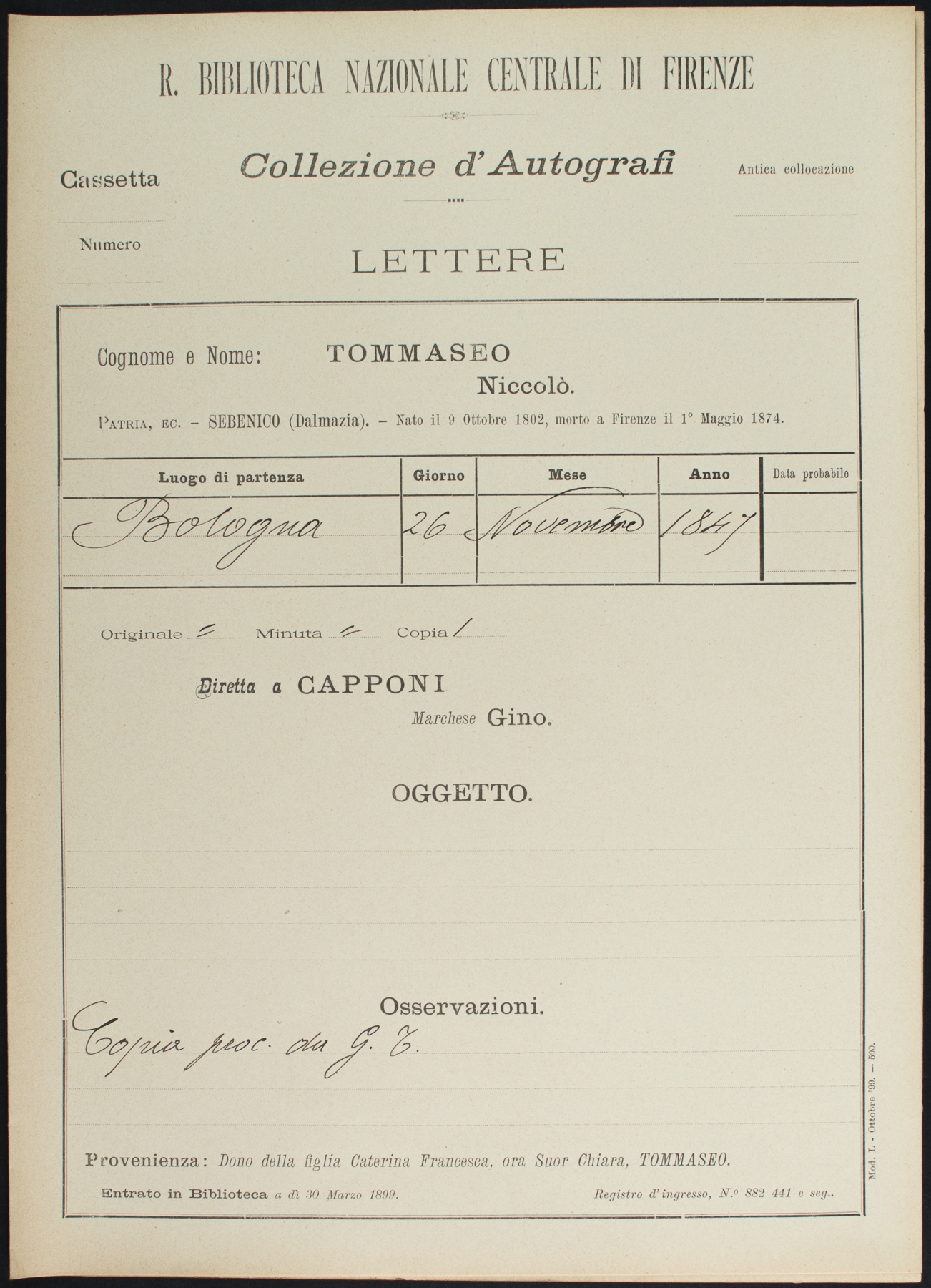Sottofascicolo N. Tommaseo a G. Capponi - 26 novembre 1847