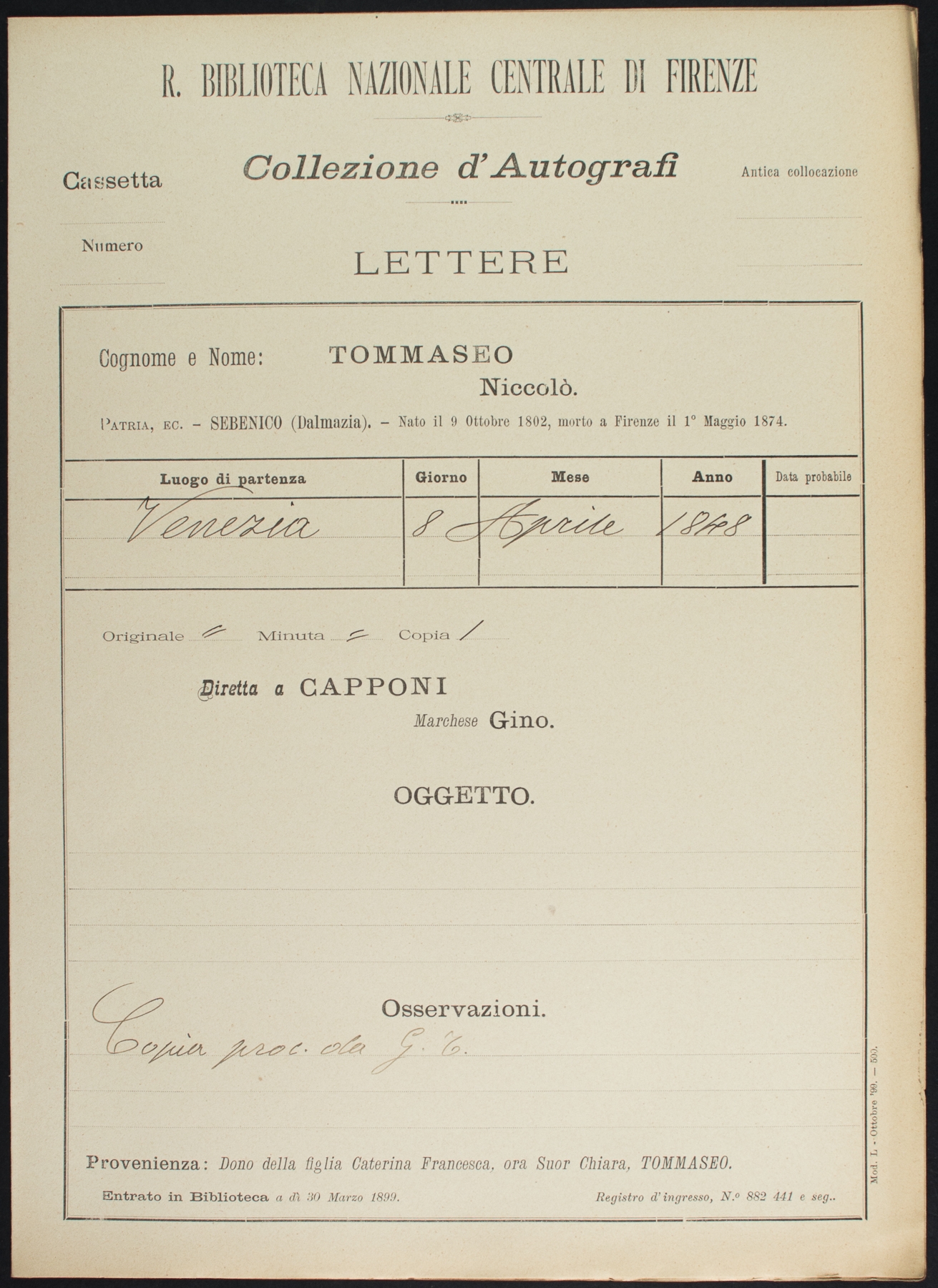 • Fondo Tommaseo presso Biblioteca Nazionale Centrale di Firenze (BNCF)