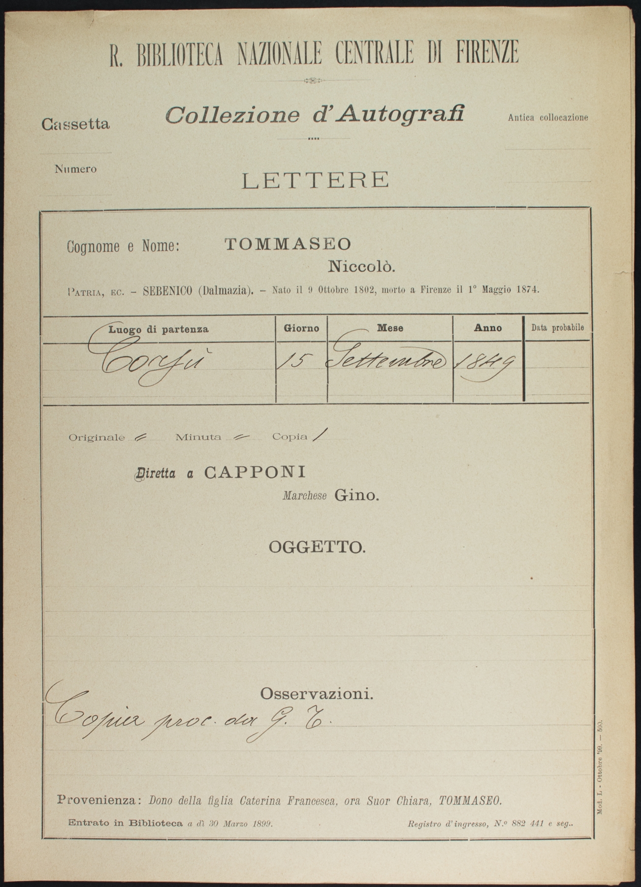 • Fondo Tommaseo presso Biblioteca Nazionale Centrale di Firenze (BNCF)